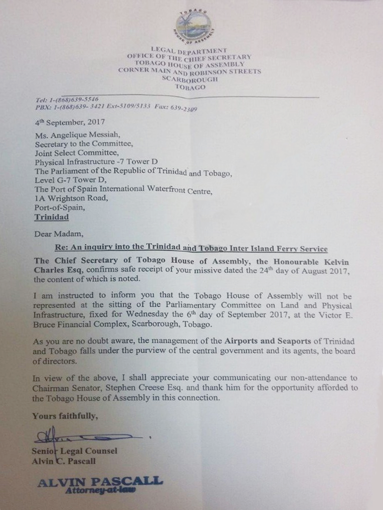 I do not have time to detail the sheer volume and contrariness of the evidence which emerged from the JSC’s several sittings this week, except that despite the evident political gamesmanship on display, it is an effective forum for forcing out the facts. I was stunned to read the THA’s 4 September 2017 letter to the JSC to decline attendance at this important inquiry on the grounds that the inter-island ferry is a matter for the Central Government. There is no doubt that the ferry issue is the greatest concern of the Tobago population at this time, rightly so, yet their elected representatives have refused to attend a lawfully-convened inquiry into that issue. Well I tell you.