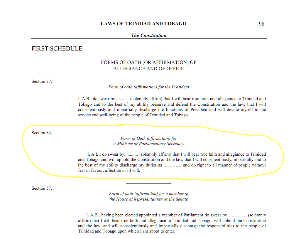 I, A.B.. do swear by………… (solemnly affirm) that I will bear true faith and allegiance to Trinidad and Tobago and will uphold the Constitution and the law, that I will conscientiously, impartially and to the best of my ability discharge my duties as ………… and do right to all manner of people without fear or favour, affection or ill will.
