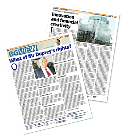 I do not think that any law or rule was broken by Mr. Coppin representing Mr. Duprey in that Court case, but my feeling about that situation is one of deep unease. It seems to me that there is a likely conflict between Mr. Coppin’s sworn duties to represent the public interest as one of our Parliamentarians and his equally serious duty to wholeheartedly represent Duprey in that litigation, given the serious negotiations between the government and Duprey.